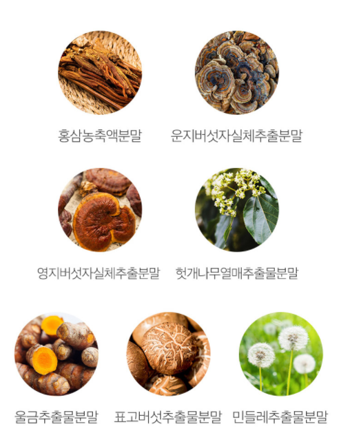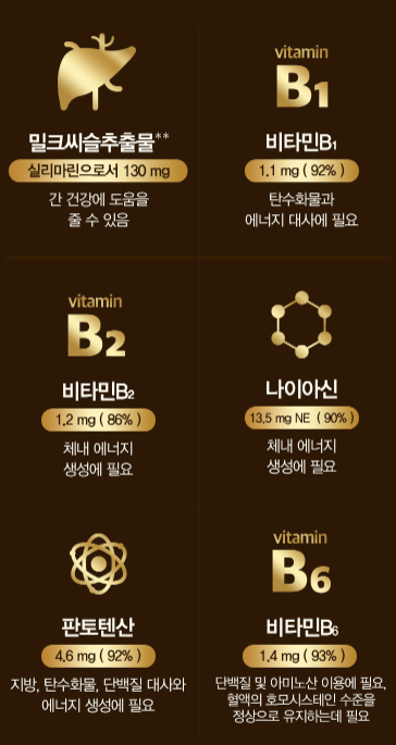 해당 제품의 효능으로는 간기능 활성화, 체내 에너지 생성 도움, 단백질 및 아미노산 보충입니다. 해당 제품에는 간 건강에 도움을 주는 실리마린 130mg 함유, 비타민 B군 5종 함유, 그리고 홍삼농축액분말, 운지버섯자실체추출분말, 영지버섯자실체추출분말, 헛개나무열매추출물분말 등 7가지 부원료도 함유시켜 더욱 건강한 제품을 완성시켰습니다.